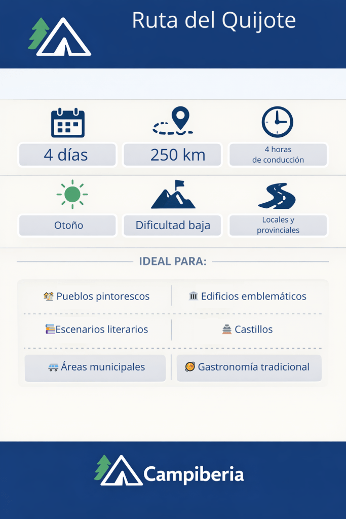 Esta ruta por las Tierras del Quijote forma parte de nuestra colección de rutas y destinos camper por la Península Ibérica, pensadas para descubrir pueblos con encanto, carreteras secundarias y formas de viajar más pausadas en camper o autocaravana.